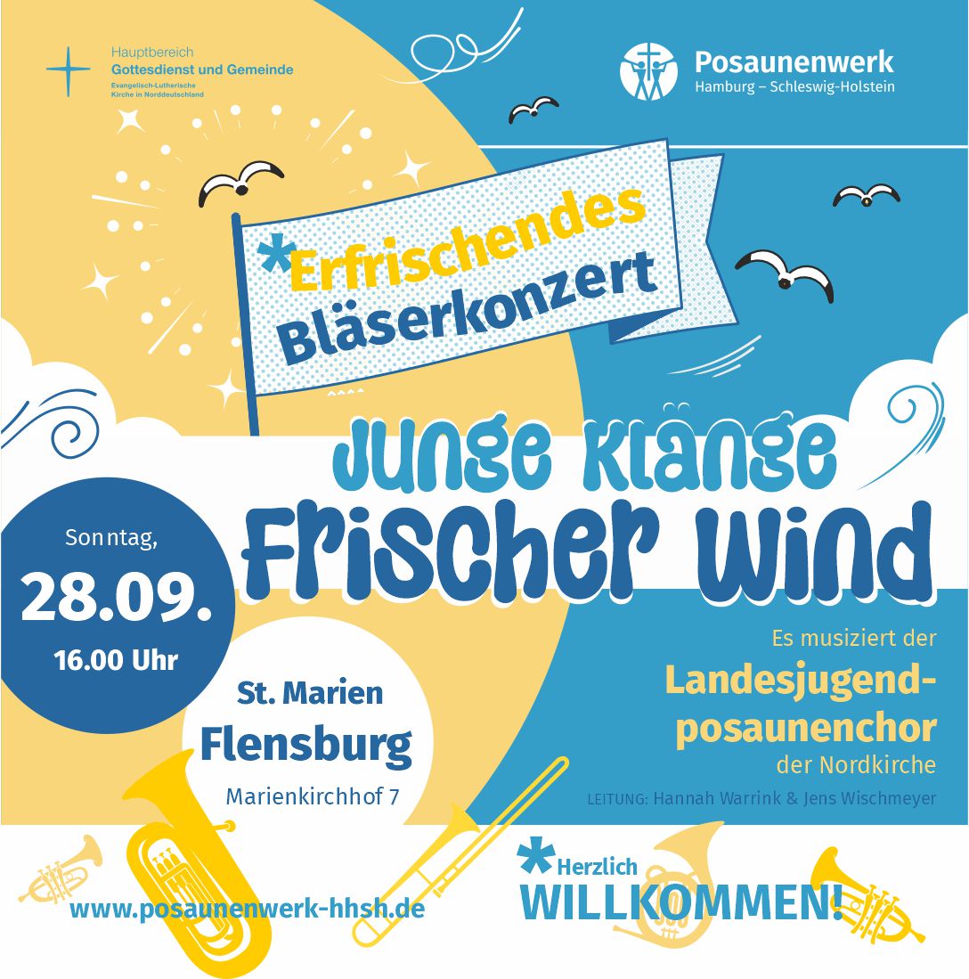 Am Sonntag, den 28. September, um 16:00 Uhr lädt der Landesjugendposaunenchor der Nordkirche zu einem festlichen Bläserkonzert in die St. Marienkirche Flensburg (Marienkirchhof 7) ein. Unter dem Motto „Junge Klänge – Frischer Wind“ erwartet die Zuhörerinnen und Zuhörer ein abwechslungsreiches Programm mit Musik voller Energie, Strahlkraft und Ausdruck.