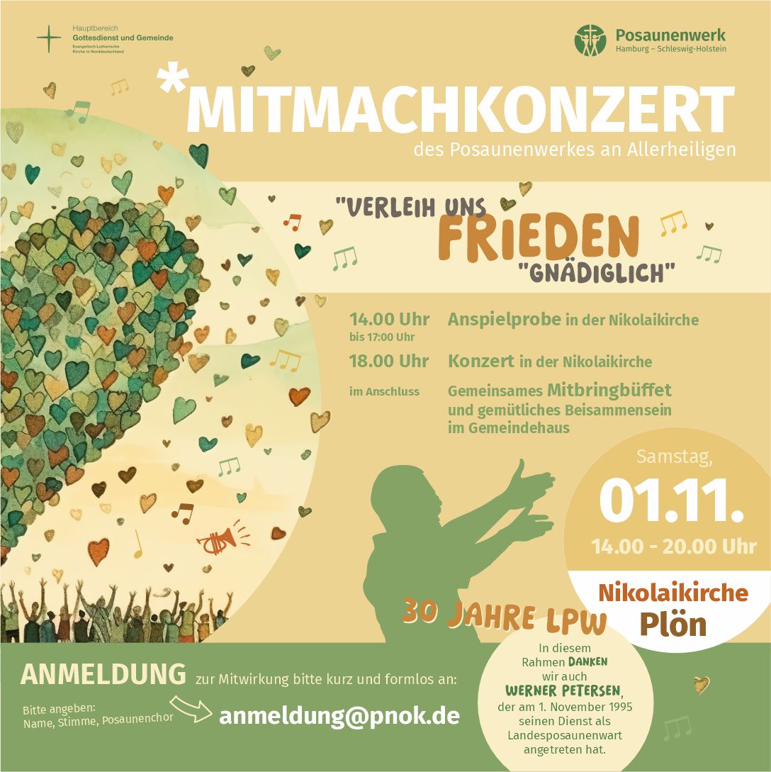 Im Namen des Posaunenwerkes laden wir Euch herzlich am 1. November 2025 zu einem Mitmachkonzert in die Nikolaikirche in Plön ein.
