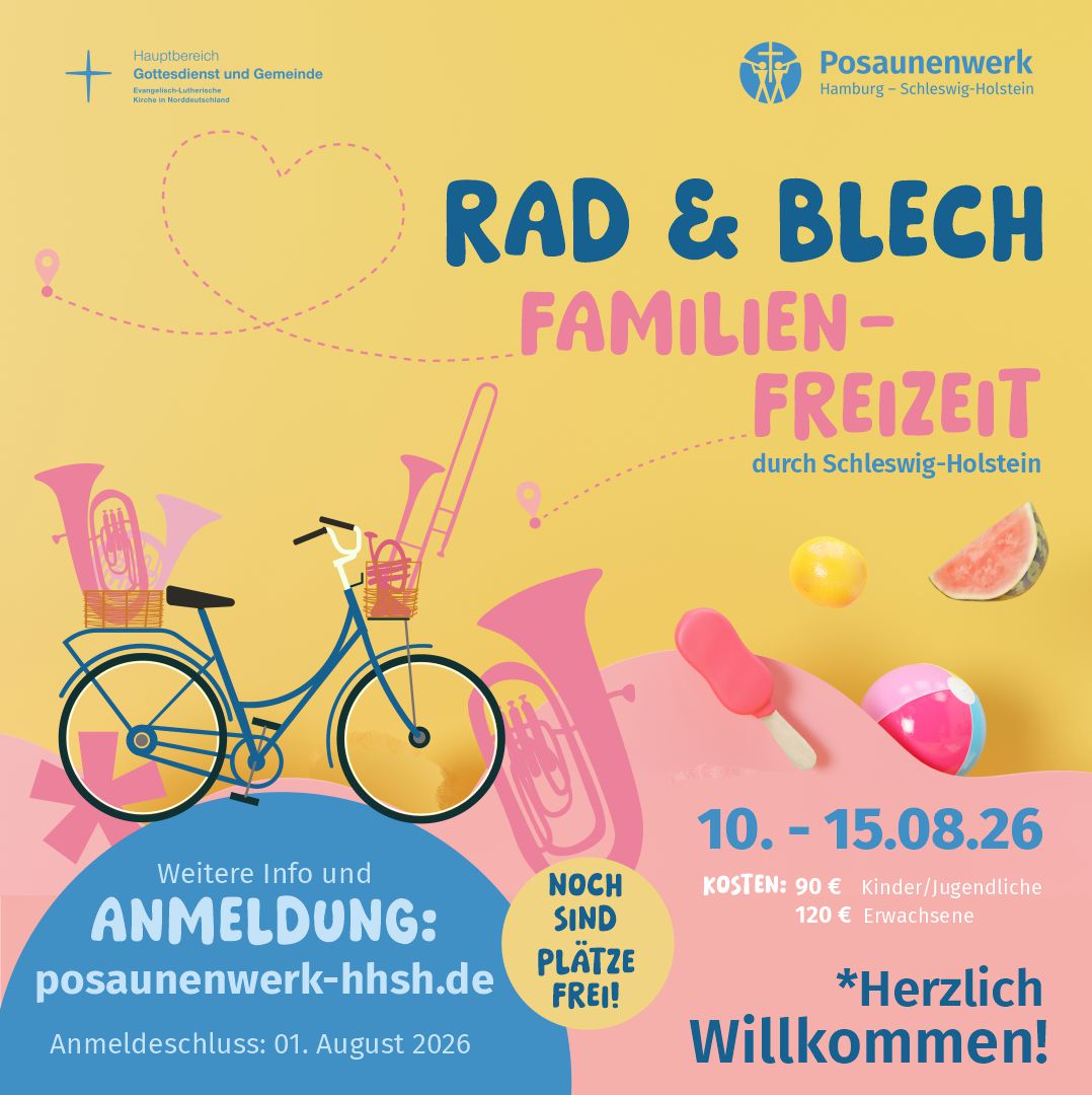 Bei der Familienfreizeit „Rad & Blech“ entdecken wir Schleswig-Holstein auf dem Fahrrad. In mehreren Etappen von etwa 30 km täglich führt die Route durch abwechslungsreiche Landschaften – unterwegs erklingt immer wieder unsere Bläsermusik: offen, spontan und einladend.